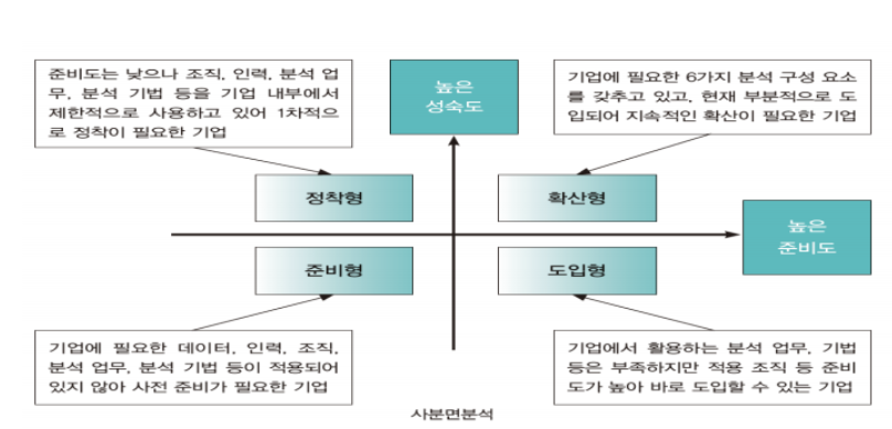 - 분석 전문가 직무 존재 - 분석 전문가 교육훈련 프로그램 - 관리자들의 기본적 분석 능력 - 전사 분석 업무 총괄 조직 존재 - 경영진 분석 업무 이해 능력 |