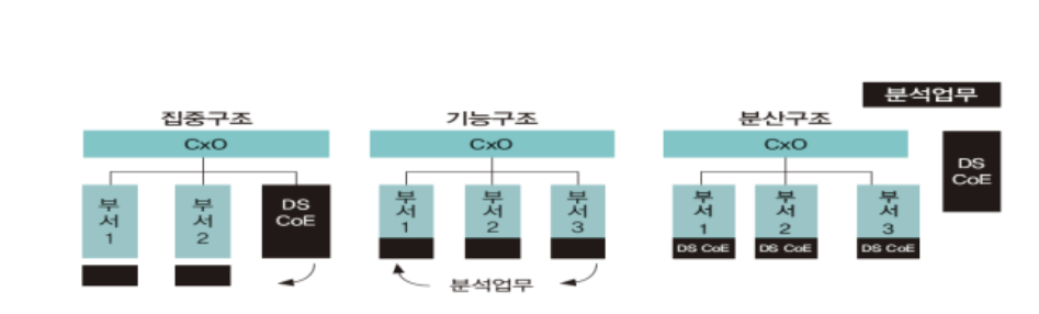 - 집중구조 : 전사 분석 업무를 별도의 분석 전담 조직에서 담당, 전략적 중요도에 따라 분석조직이 우선순위를 정해서 진행가능, 현업 업무부서의 분석 업무와 이중화/이원화 가능성 높음