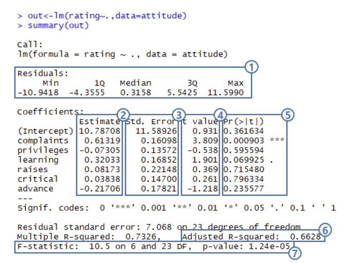 4. t value: 절대값의 크기는 독립 변수들간에 종속변수에 영향력의 상대적 크기를 의미. (독립변수와 종속변수간의 선형성의 강도를 의미), 수식: 회귀계수/표준오차. 회귀계수들이 유의미한가? 회귀계수의 t값과 유의확률로 확인.