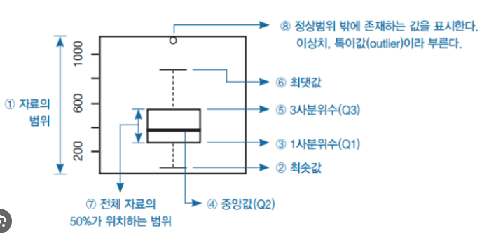 - 최댓값 : Q3 + 1.5(Q3-Q1), 최솟값: Q1 - 1.5(Q3-Q1)