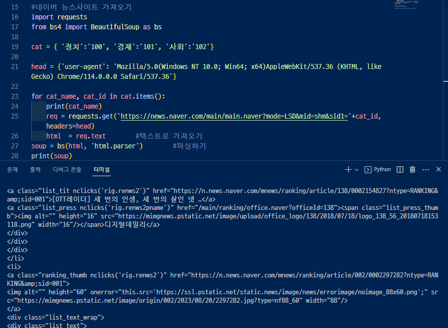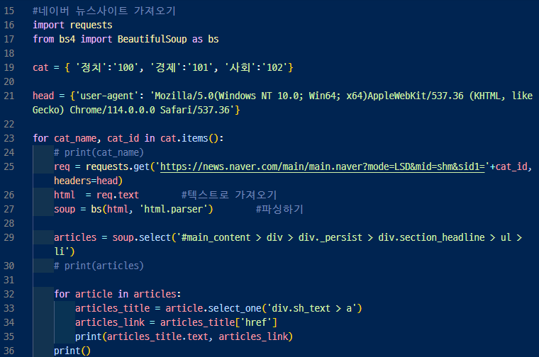 ▼ 정치,경제,사회면도 가져오기 위해서 주소 뒤에 바뀌는값을 딕셔너리로 만들어주고 for문을 써서 불러온다