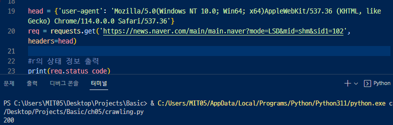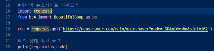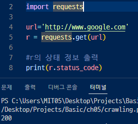▼ requests를 사용하여 상태 정보 출력해봄. 200이니까 정상, 성공이라는 얘기 .