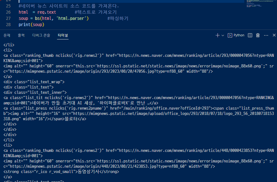 BeautifulSoup을 통해 파싱하고나면 출력화면이 html 처럼 깔끔하게 정리되어서 나온다