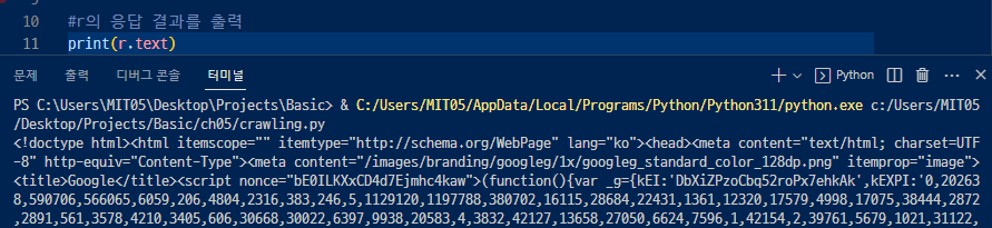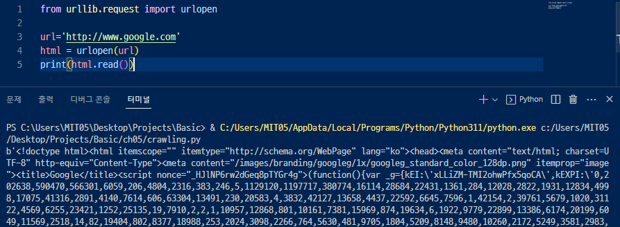 ▼ 텍스트 형태로 결과(내용)를 불러옴. 앞에 'b'가 없는걸 보면 바이너리 코드가 아닌 텍스트인걸 확인할 수 있음.