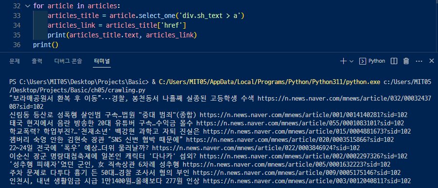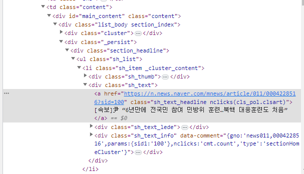 제목과 연결 링크만 가져오기 위해 select와 select_one 메서드를 사용