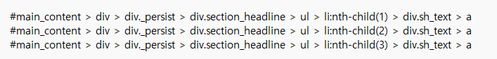 >> 클릭한 부분에서 오른쪽 클릭 + Copy 를 하면 위치를 복사할수있음. 여기서는 copy selector 를 한 것