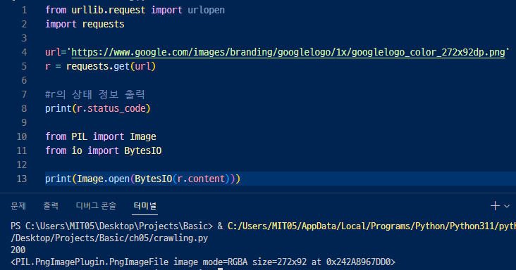 ▼구글 로고를 가져오기 위해서 구글 로고의 이미지 주소를 불러와 객체 형태로 메모리에 저장된 것을 확인할 수 있음.