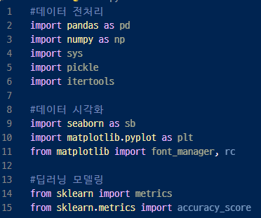 데이터 구성 및 문제 정의 > 라이브러리 불러오기 > 데이터 셋 불러오기 > 데이터 전처리 > 모델링