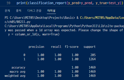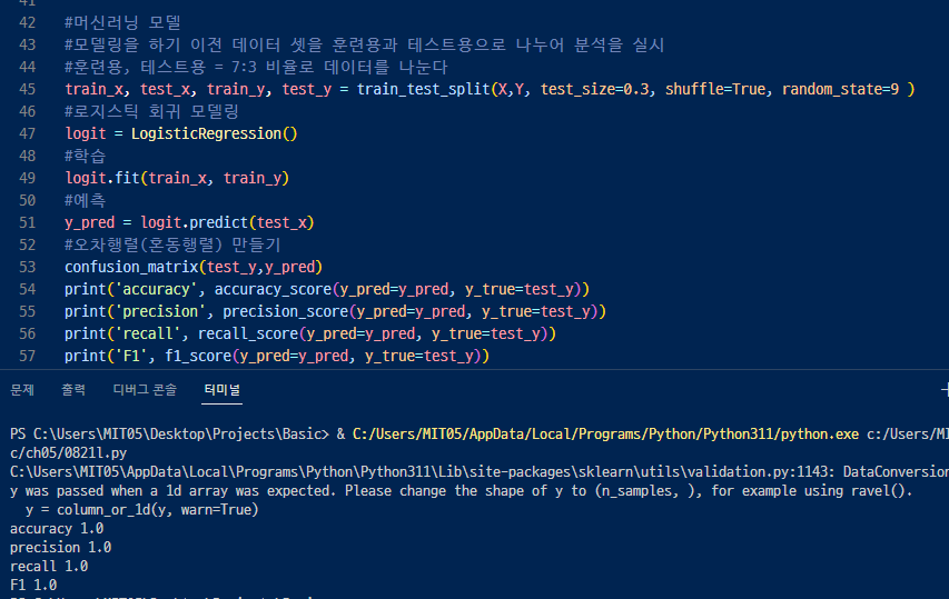 정확도 정밀도 재현율 F1왜 다 1.0...........................................?