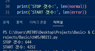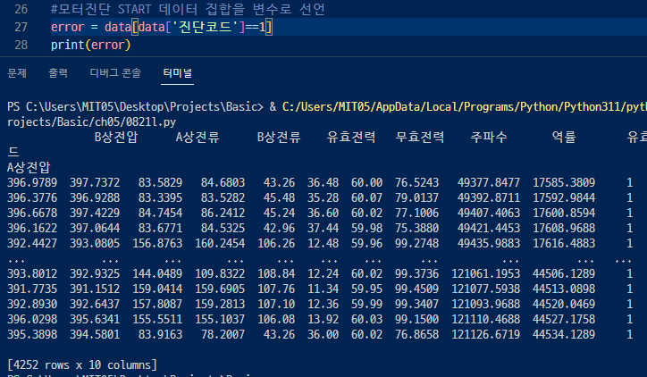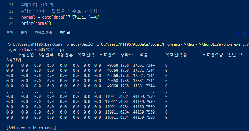 진단코드가 0인 데이터들을 normal(정상 데이터) 변수에 선언, 1인데이터들은 error 변수에 선언
