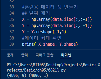 ▶ 훈련용 데이터 셋에 적용할 수 있도록 치환해준다. array형태로 치환해주고 형태를 확인함