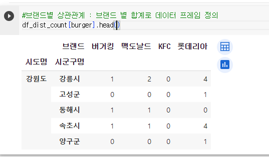 ▶ 시도명, 시군구명, 브랜드 순서대로 groupby한다음에 숫자를 세고 결측치는 0으로 채우고 astype를 이용해 int로 자료형을 바꿔줌