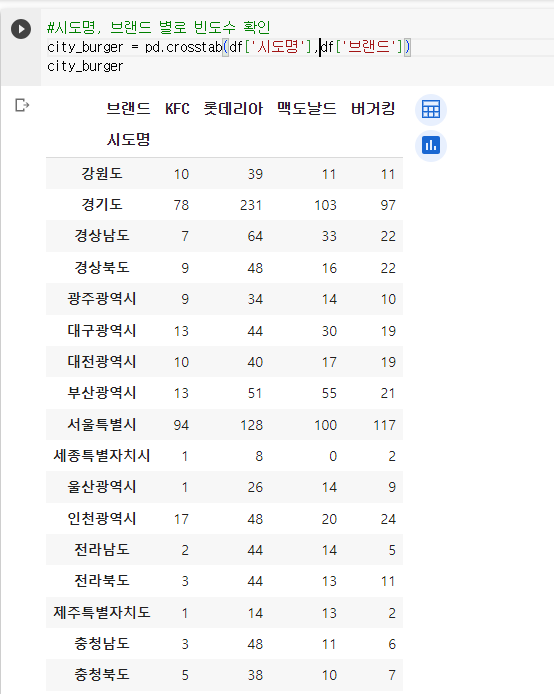 ▶각 브랜드 별로 시도에 나눠서 몇개씩 있는지 확인해보고
