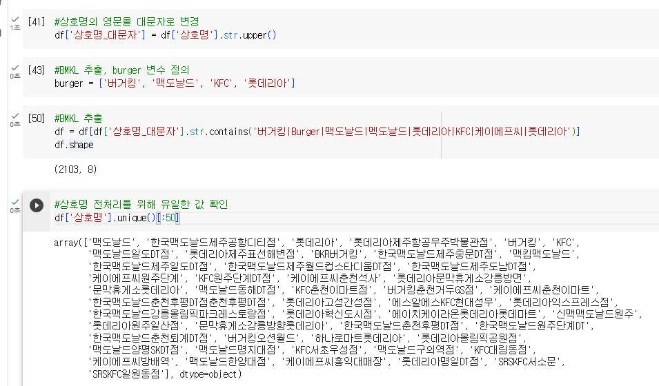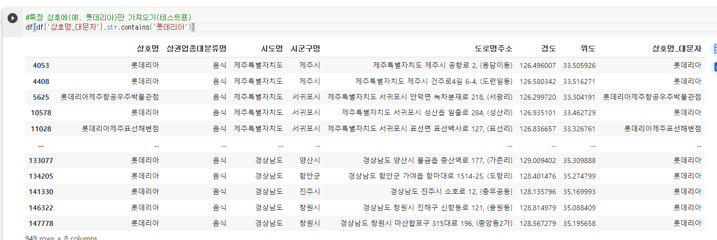▶ '상호명_대문자'에 '롯데리아라는 것이 contains 된다면 '브랜드'를 새로만들어서 '롯데리아'라는 값을 채워넣자