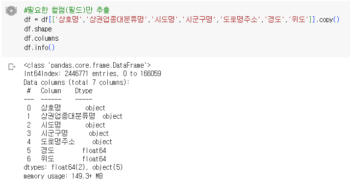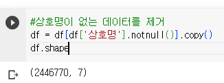 ▶ 상호명이 없는 데이터를 제거함. 그랬더니 1개 없어짐. 줄어들었음