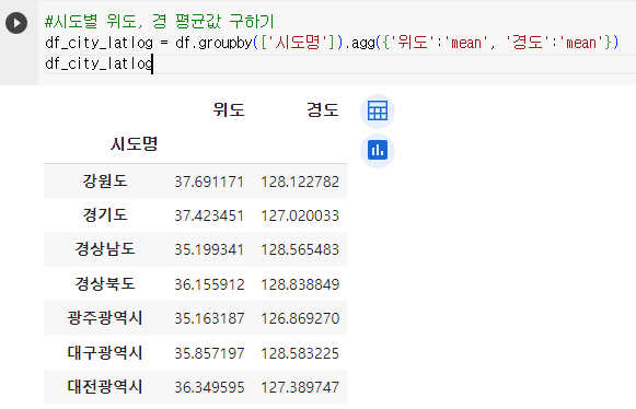 ▶ 시도별 위도, 경도 평균값을 구해봄
