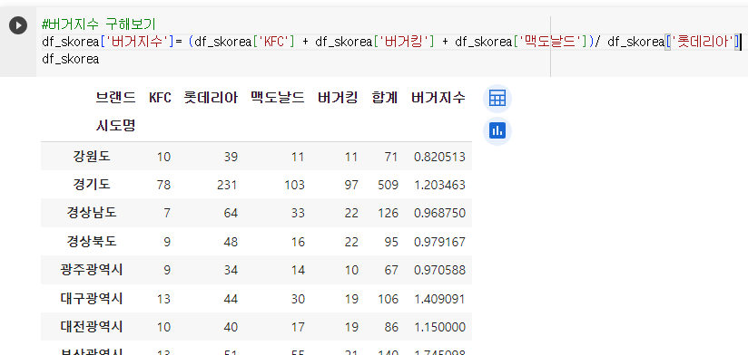 ▶ 시군구별로 버거지수를 구해서 새로운 열로 추가해봄