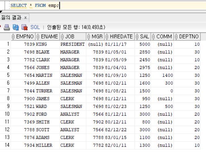 > * 을 사용하면 모든 열과 모든 행을 출력할 수 있음.