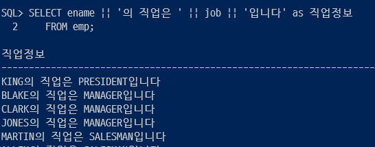 > concatenation operator (연결 연산자)를 이용하면 컬럼과 컬럼을 연결해서 볼 수 있음