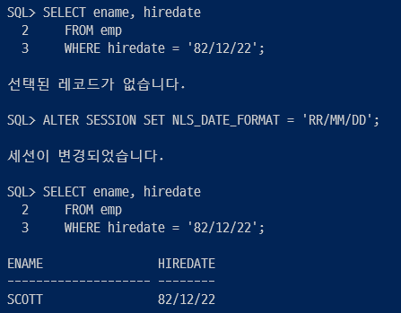 ▶ 레코드가 있지만 나오지 않는 이유는, 날짜형식이 다르기 때문에. 그래서 현재 접속한 세션(session)의 날짜 형식을 확인해야함.