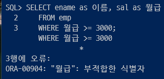 - ORDER BY에서 식별자(별칭)으로 해도 됐었는데 WHERE 절에서는?