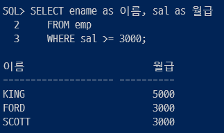- 월급이 3000 이상인 사원들의 이름과 월급을 출력하는 SQL 문