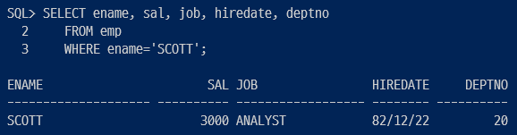 - 이름이 SCOTT인 사원의 이름, 월급, 직업, 입사일, 부서 번호를 출력