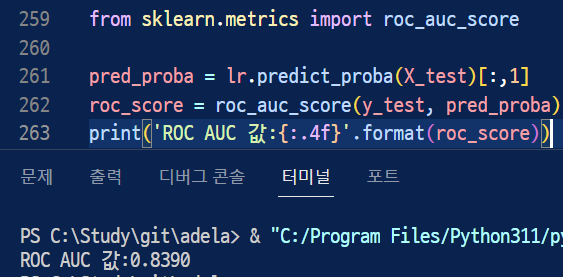 그리고 계속해서 만들어온 get_clf_eval에 AUC구하는것도 추가해보면