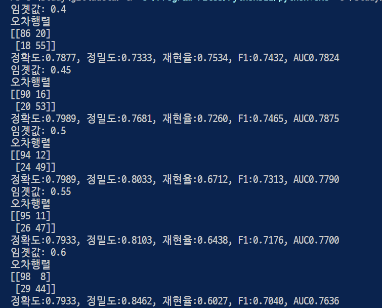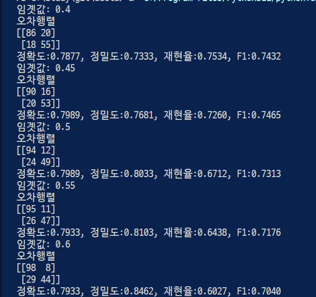 결과값을 본다면 F1임곗값이 0.6일 때 가장 높음.