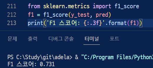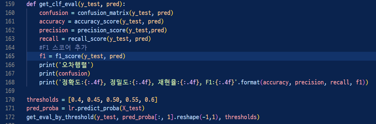 이전에 만들었던 get_clf_eval 함수에서 F1을 구하는 코드를 출력하는 코드를 다시 적고