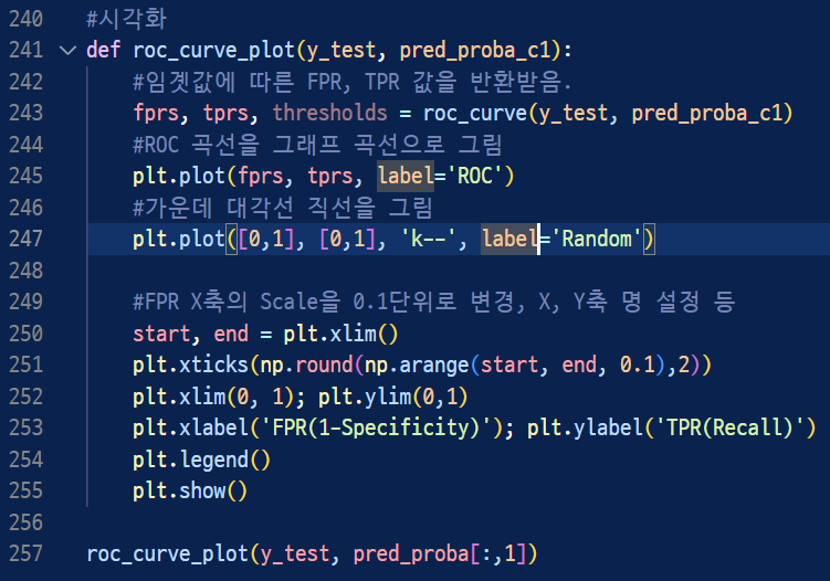 - FPR이 X축, TPR이 Y축으로 잡으면 FPR의 변화에 따른 TPR의 변화가 곡선 형태로 나타남.