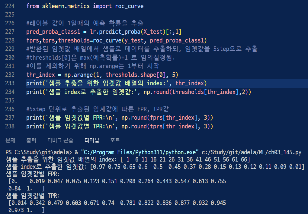 ▶ 타이타닉 생존자 예측 모델의 FPR, TPR, 임곗값을 구해보자면