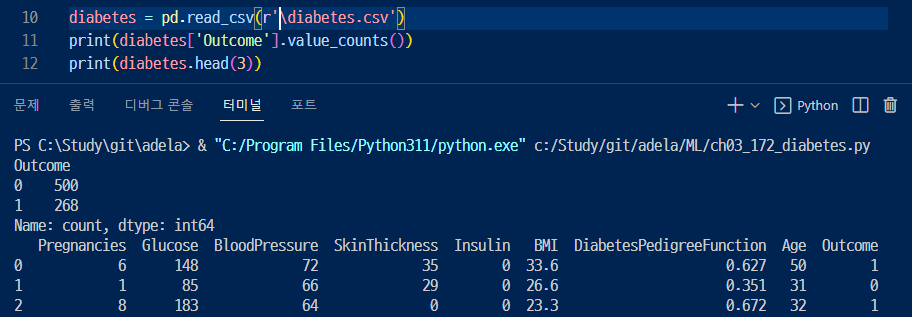 데이터 세트 : https://www.kaggle.com/datasets/uciml/pima-indians-diabetes-database