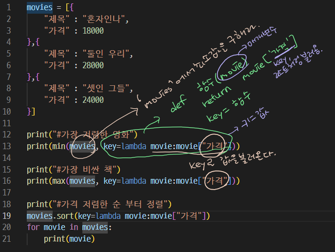 ▶ min() + max () + lambda + 콜백 함수 + sort