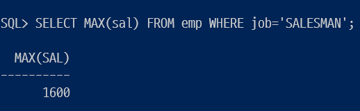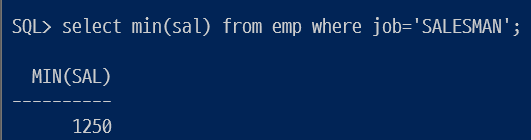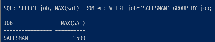 FROM emp에서 WHERE job='SALESMAN'의 조건을 가진 GROUP BY job으로 그룹핑해서
