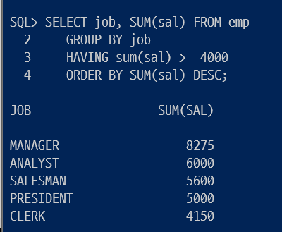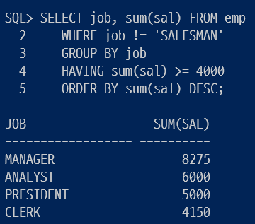 HAVING sum(sal)>=4000가 TRUE인 행만 ORDER BY 정렬하여 SELECT 출력한다