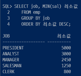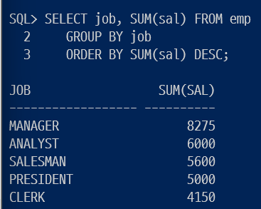 ORDER BY DESC를 해서 정렬한 후에 job과 SUM(sal)을 출력한다.