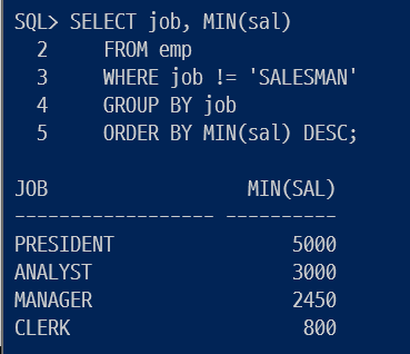 ▷ FROM emp에서 WHERE job != 'SALESMAN'을 하고 GROUP BY job으로 그룹핑을 한 후