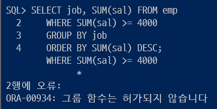 그룹함수의 조건을 할 때는 WHERE절이 아닌 HAVING 절이다.