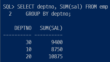 ▷ FROM emp에서 GROUP BY job으로 그룹핑하고 sal을 SUM해서