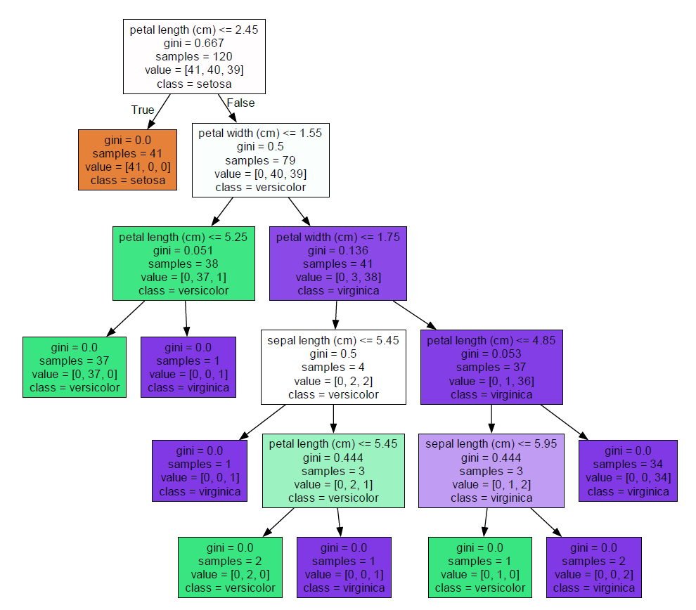 ▶ 각 노드의 색깔은 레이블 값을 의미함, 색이 짙을 수록 지니계수가 낮고 해당 레이블에 속하는 샘플 데이터가 많다는 것