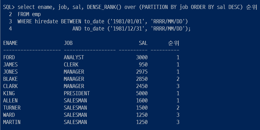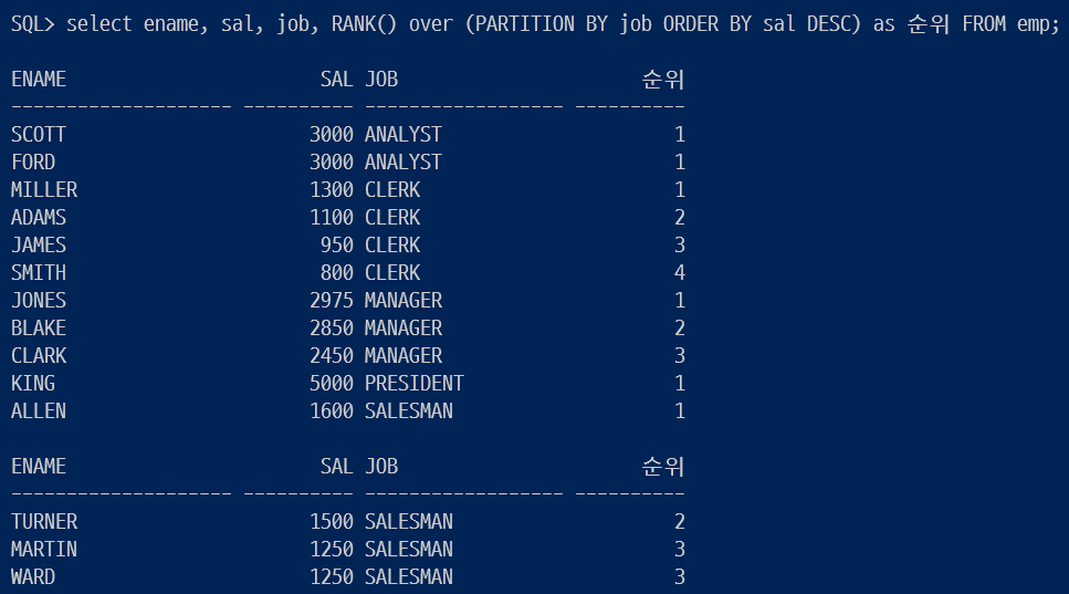 ▶ 직업별로 묶어서 순위를 부여하기 위해 ORDER BY 앞에 PARTITION BY job 을 사용해서 해봄