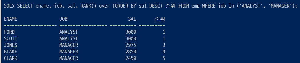 ▼ 직업이 analyst, manager인 사원들의 이름, 직업, 월급, 월급의 순위를 출력하면 다음과 같음
