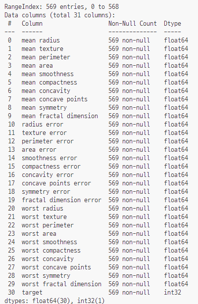 - 종양의 크기, 모양 등 다양한 속상값을 기반으로 악성/양성 분류한 데이터