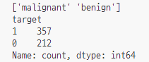 악성 malignant 가 0, 양성 benign이 1로 되어있음. 분포를 확인해보면