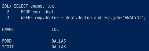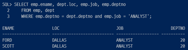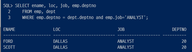 ▷ emp.deptno = dept.deptno 는 조인 조건. emp.job ='ANALYST'는 검색 조건