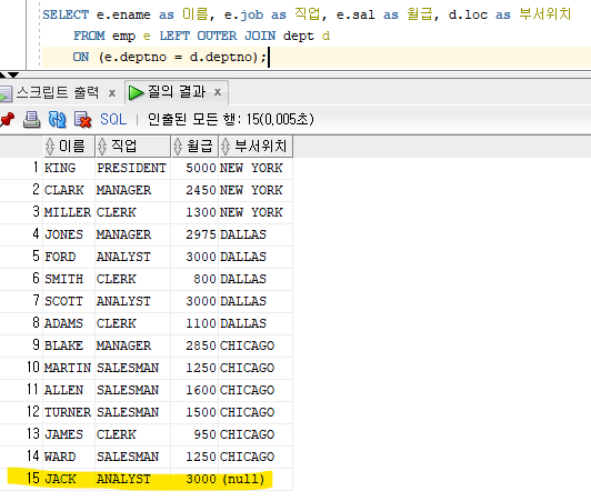 ▷ JACK이 근무하는 부서번호와 동일한 번호가 dept 테이블에 없기 때문에 null값.