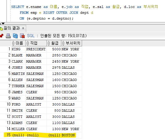 BOSTON에 있는 직원은 없지만 RIGHT OUTER JOIN이니까 DEPT의 데이터는 모두 출력됨.