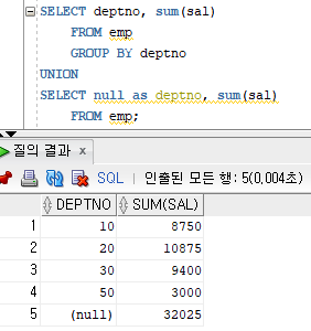 ▷ UNION ALL로 출력했을 때는 deptno 결과 데이터들이 순서 없이 출력됐는데
