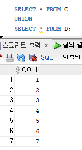 ▷ UNION 으로 출력했을 때는 COL1 데이터가 중복된 것은 제외된 채 출력된다.